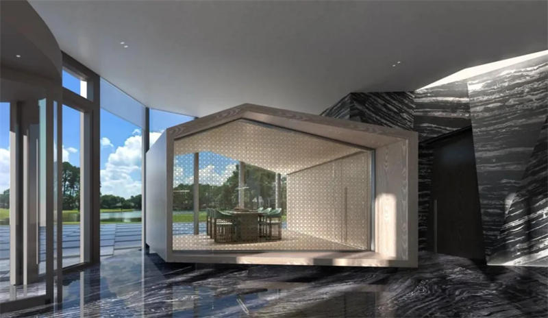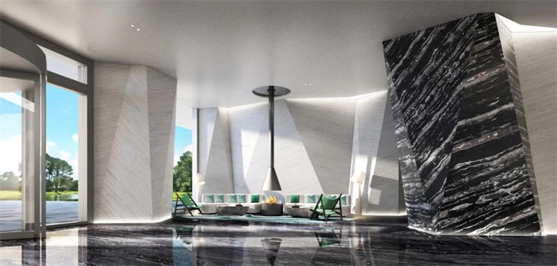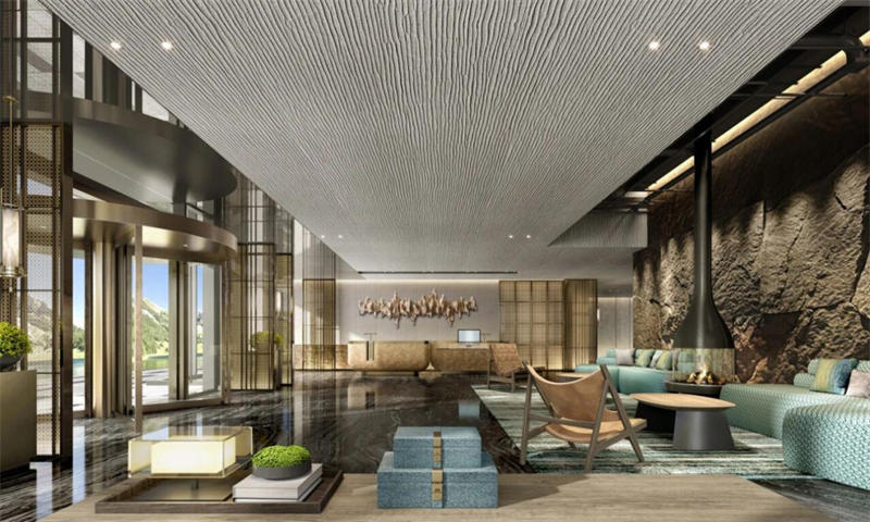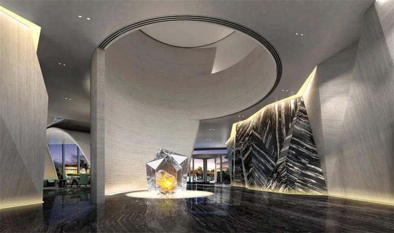 大堂以艺术馆的形式呈现,简约中见山韵,概念化山形结构营造出接近心灵的艺术氛围。以艺术为引,让精神与自然更近一步。
