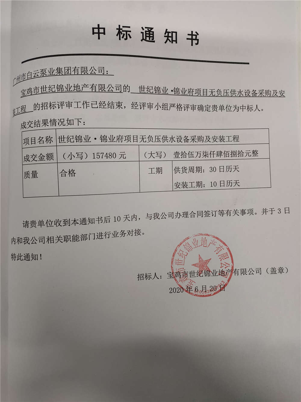 世纪锦业●锦业府项目无负压供水设备采购及安装工程中标通知