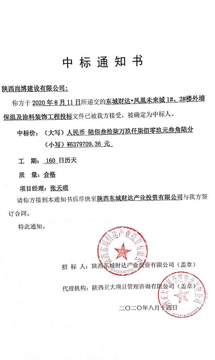 东城财达●凤凰未来城 1# 2#楼外墙保温及涂料装饰工程中标通知书