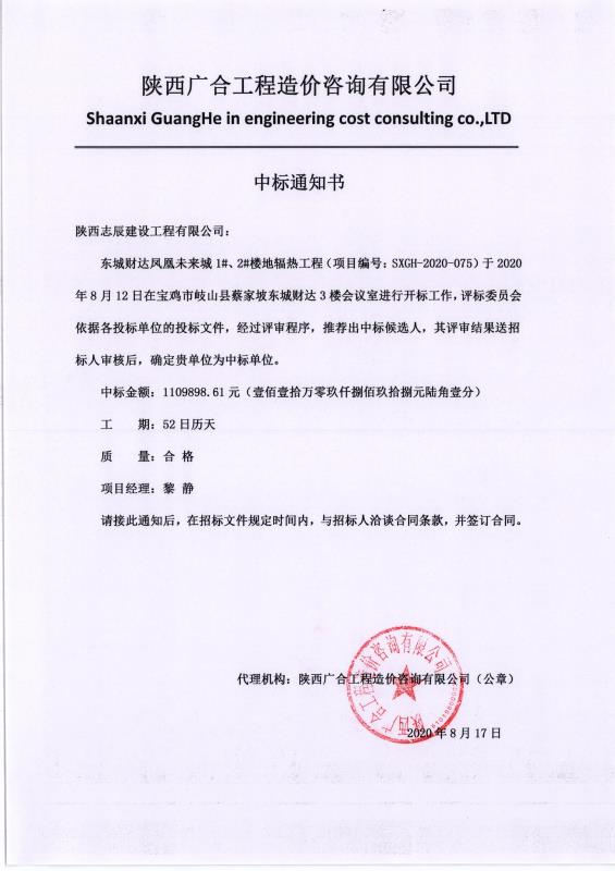 东城财达凤凰未来城1# 2#楼地辐热工程中标通知书