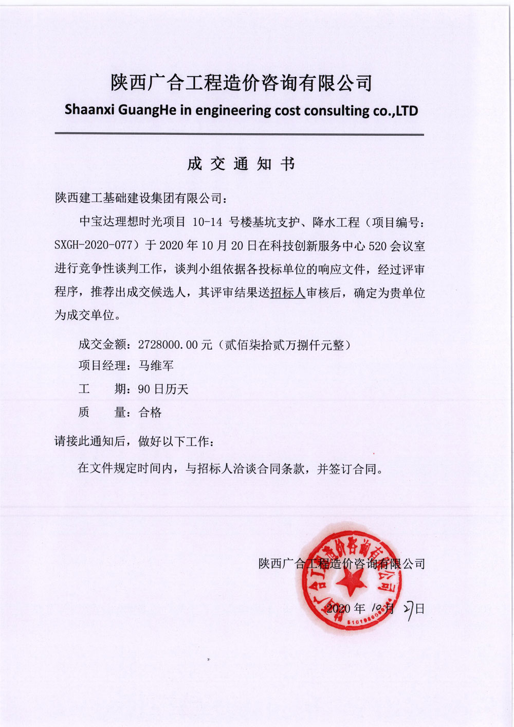 理想时光项目10—14号楼基坑支护、降水工程中标通知书