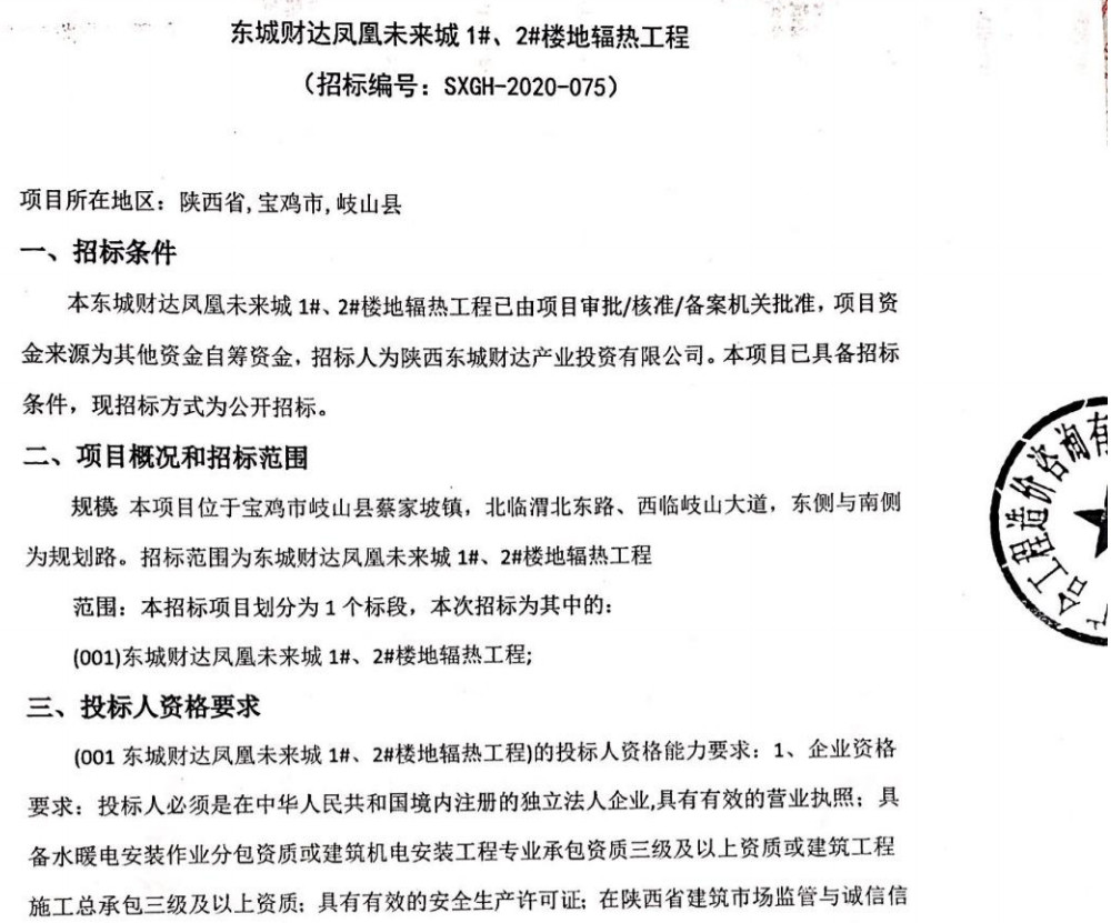 东城财达凤凰未来城1# 2#楼地辐热工程招标公示
