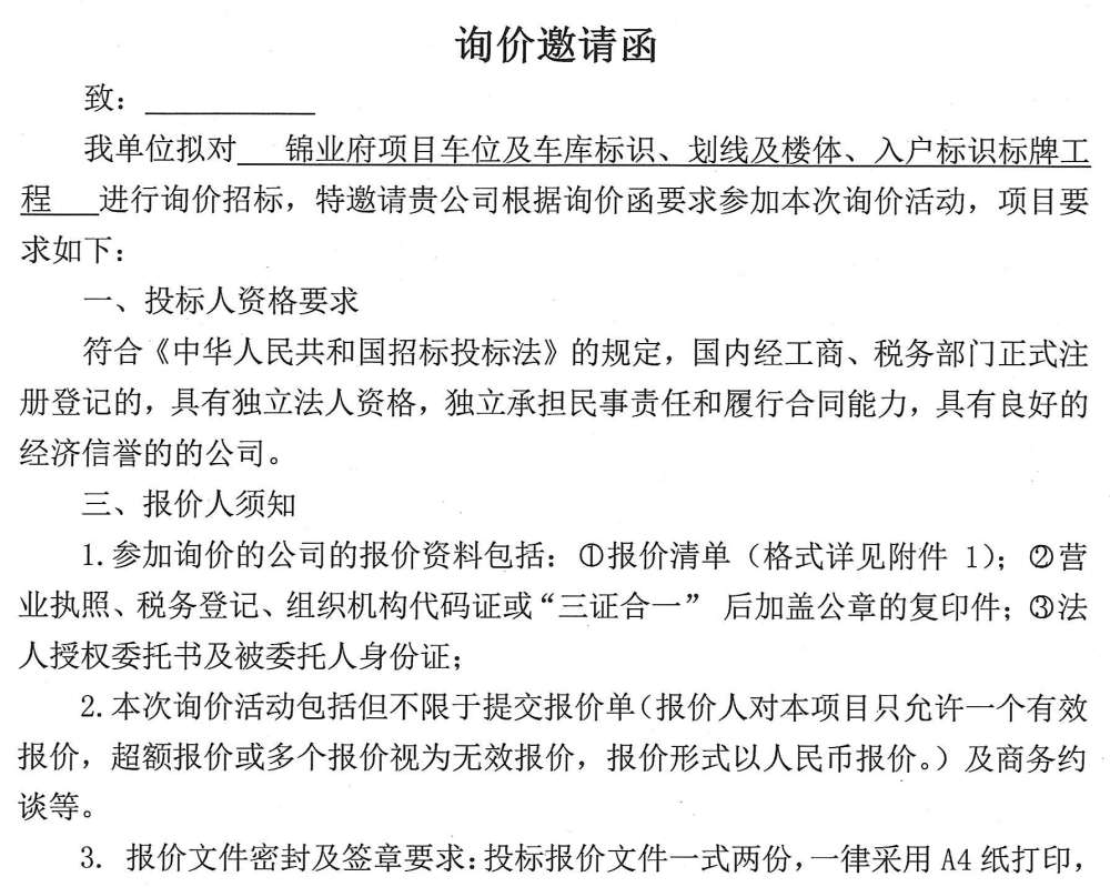 锦业府项目车位及车库标识、划线及楼体、入户标识牌工程询价邀请函
